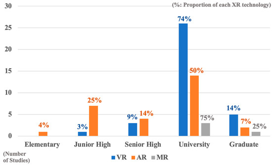 Based on the literature analysis results, Figure 4 illustrates that in higher education, universities and graduate schools are the primary settings for the application of XR technologies. At the university level, 26 studies (74%) utilized VR ([5,13,17,19,21,22,24,25,26,27,29,30,31,32,33,34,35,36,37,38,39,40,41,42,43,44]), 14 studies (50%) applied AR ([13,36,38,45,46,49,50,51,56,57,59,60,61,63]), and 3 studies (75%) employed MR ([9,64,65]). At the graduate level, five studies (14%) used VR ([18,20,21,32,35]), two studies (7%) applied AR ([48,56]), and only one study (25%) adopted MR ([64]). Additionally, five studies implemented XR technologies across both university and graduate levels ([21,32,35,56,64]). This concentration in higher education is largely due to the emphasis on integrating theoretical and practical learning in advanced curricula.