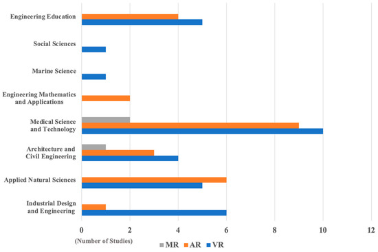Figure 5 illustrates the application of XR technologies across various scientific and educational disciplines. In the field of medical sciences and technology, particular emphasis is placed on the integration of XR technologies, including medical training simulations and surgical rehearsals. Within this field, MR technology is applied in 2 studies ([9,64]), AR technology in 9 studies ([13,38,45,48,49,50,57,61,63]), and VR technology is the primary technology utilized, appearing in 10 studies ([13,19,20,29,32,33,34,38,41,42]).