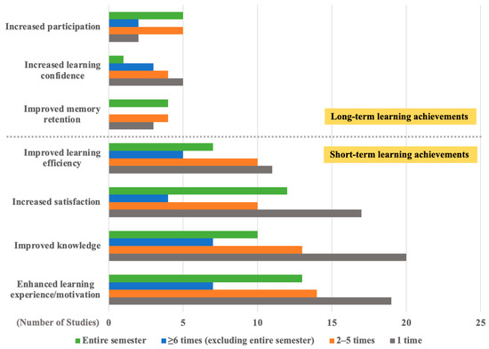 A subset of longer-term interventions reported continued improvements in participation, memory retention, and learning confidence. When the usage frequency increased to 2–5 times, participation was highlighted in five studies ([7,37,38,53,58]), while memory retention ([12,23,33,61]) and learning confidence ([33,38,41,54]) were mentioned in four studies each. Similarly, during semester-long applications, five studies reported increased participation ([28,31,34,35,65]), four studies noted improvements in memory retention ([28,31,34,43]), while learning confidence was documented in only one study ([22]).