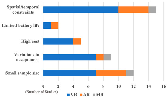The second most frequently mentioned limitation is small sample size, noted in 12 studies, including 7 that employed VR ([11,20,25,27,29,40,43]), 4 using AR ([12,50,57,62]), and 1 utilizing MR ([64]). Variations in student acceptance were highlighted in 9 studies, with 7 studies on VR ([11,17,18,24,28,37,43]) reporting issues such as dizziness or discomfort when using head-mounted devices, while AR ([48]) and MR ([64]) were each mentioned in one study.