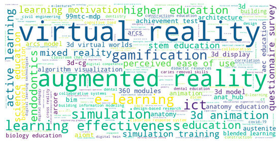 Table A2 summarizes the most frequently occurring keywords, while Figure 10 presents a word cloud illustrating their relative prominence. “Virtual reality” (24 mentions) and “augmented reality” (16 mentions) remain the most common terms, reflecting the established focus on these two XR modalities. Meanwhile, keywords such as “e-learning”, “gamification”, and “simulation” suggest a growing interest in interactive and digitally integrated teaching methods. Less frequent but noteworthy terms, such as “mixed reality”, “learning motivation”, and “learning effectiveness”, indicate potential directions for further investigation, including the design of immersive MR scenarios and the assessment of XR’s impact on learner engagement. Although “mixed reality” appears fewer times than VR and AR, its presence implies a gradual shift toward more advanced XR setups that combine real-time spatial mapping and virtual content. Additionally, terms like “ICT”, “3D animation”, and “stem education” signal broader trends in digital pedagogy and subject-specific applications. Collectively, these emerging keywords underscore the evolving landscape of XR research, pointing to future expansions in multi-user environments, gamified approaches, and data-informed evaluations of learning outcomes.