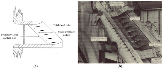 The principle of linear cascades can be considered to have emerged during World War II and developed afterward. Locating the exact primary publication can be challenging, with most experimental campaigns on linear cascades attributed to the National Advisory Committee for Aeronautics (NACA) [] and disseminated in a series of publications called Wartime Reports []. One of these reports can be considered the first to describe experimental work on a linear cascade; titled “Preliminary Experimental Investigation of Airfoils in Cascade” [], it focused on cascade arrangements of airfoils and examined aerodynamic performance factors like pressure distribution and airflow through the blades. This study became a critical early reference for cascade testing methods in compressors and turbines. It represented one of the first structured approaches to studying airfoil behaviour in cascades and provided data crucial to advancing blade designs in turbomachinery. The rudimentary experimental setup can be observed in Figure 1a. Subsequent technical reports on linear cascades followed. Another report from the same series, titled “Systematic Two-Dimensional Cascade Tests of NACA-65 Series Compressor Blades at Low Speed” [], describes the 5-inch cascade installation at Langley, identifying it as a fully functioning system built in the 1940s and improved in the early 1950s. The Langley cascade is pictured in Figure 1b.