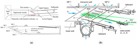 (a) Schematic of simplified transonic cascade wind tunnel in the University of Tokyo [] (b) test section and light sheet orientation for PIV for the transonic cascade wind tunnel at the DLR Institute of Propulsion Technology; [].
