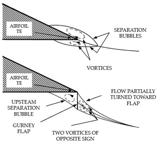 Figure 4 illustrates the flow near the trailing edge of a conventional airfoil at a moderate lift coefficient, emphasizing the separation bubbles formed both with and without a Gurney flap.