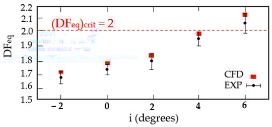 Wei’s [] study on three-dimensional separation at the juncture of the endwall and blade corner region aimed to use prediction parameters to gain an early insight into the flow field behaviour within the cascade, prior to conducting experimental and numerical analyses. The equivalent diffusion factor DFeq Equation (1) [] is employed to predict separation at mid-span. The experimental DFeq values are derived from the five-hole pressure probe measurements. It is observed that the flow at mid-span does not separate at i = 4° but does separate at i = 6°, as shown in Figure 7, which presents both experimental and numerical results of the parameter. Another factor was earlier, proposed by Lei [], the diffusion parameter D Equation (2) [] to predict the size and intensity of the corner stall. The size and strength of the corner stall increase with incidence. According to this prediction, large separation regions on both the suction side and the endwall occur when i > 8.3°.