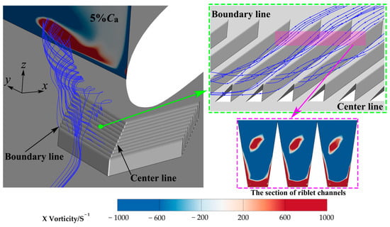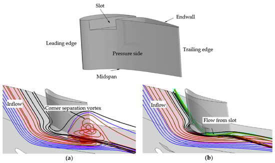 Volume streamlines in the flow passage: (a) original cascade; and (b) slotted cascade [].