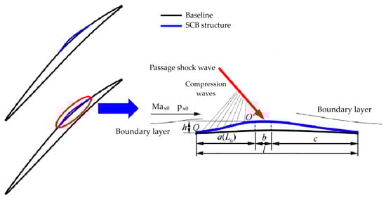 - Xu, W.; Sun, P.; Yang, G. Effect of the bionic chamber position on the aerodynamic performance in a transonic compressor cascade. Aerosp. Sci. Technol. 2021, 119, 107106. [Google Scholar] [CrossRef]