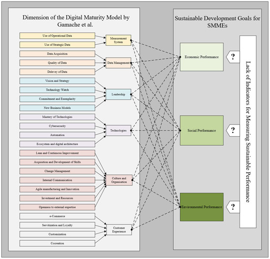 Based on this model, it has been easier to clarify the gap to be addressed in relation to the issue discussed in this article. Indeed, the conceptual framework presented in Figure 2 visually represents the gap that must be bridged to achieve the objective stated previously. Although the Gamache digital maturity model provides valuable indicators of the digital maturity of SMMEs, these indicators do not directly measure core performance aspects related to the organisation’s social, economic, and environmental aspects. The digital maturity evaluation as proposed by this model does not cover the sustainable benefits of a DT, leaving a gap between technology adoption and the achievement of sustainable performance. The right side of Figure 2 shows the lack of indicators to measure sustainable performance. This absence of indicators prevents analysis of the relationships between the dimensions of the Gamache digital maturity model and the dimensions of sustainable development. It is therefore very difficult for SMMEs to understand the impact of their digital actions on their core objectives. In this figure, the dashed lines represent conceptual links between digital maturity dimensions and sustainable performance indicators that are proposed by the authors but have not yet been empirically validated. The question marks (?) highlight areas where no direct or documented indicators could be identified in the literature, illustrating gaps that still need to be addressed through further research.