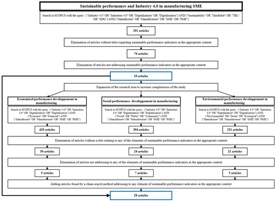 Initially, the literature review was guided by the intersection of the concepts of I4.0, sustainable performance, and SMMEs. The first article search was thus driven by the query: (“Industry 4.0” OR “Industries 4.0” OR “Digitalization” OR “Digitalisation”) AND (“Sustainability” OR “Durabilité” OR “TBL” OR “SDG”) AND (“Manufacture” OR “Manufacturier” OR “SME” OR “PME”) in the SCOPUS search engine. This search yielded 291 articles, of which 76 had titles addressing sustainability or performance in SMMEs. After reviewing the 76 articles, 10 were ultimately deemed relevant to achieving the objective of this research.