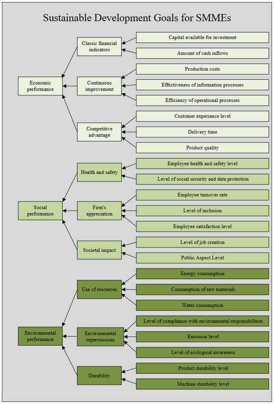With this perspective, business objectives are closely tied to sustainable performance, encompassing economic, social, and environmental aspects. Studies show that owner-managers of SMMEs are motivated by goals related to sustainable development and social responsibility, thus shaping their understanding of performance [7]. Adopting participative management practices, such as involving employees in setting organisational objectives, leads to improved performance and a lasting competitive advantage [8]. In other words, the core objectives of SMMEs are connected to enhancing their sustainable performance. These objectives are defined by improving economic, social, and environmental dimensions [9,10,11,12].