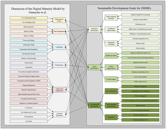 Several authors have proposed measuring specific dimensions of I4.0 to gain more insights into the performance and digital maturity of SMMEs. However, by not measuring the link between these metrics and sustainable performance, they only partially address the identified gap. In aiming to bridge the gap between digital maturity measurement and sustainable performance, it is valuable to build upon existing work on digital maturity. This approach allows the results of this literature review to focus on the part of the gap concerning sustainable performance. Therefore, to bridge the gap between digital maturity and sustainable performance, this research proposes integrating sustainable performance indicators into the model from [26]. In addition to reviewing the literature, we adopt a structured approach to identify and organise these indicators, highlighting the conceptual basis for their integration. This integration will enable the evaluation of not only the digital maturity of SMMEs but also their performance in terms of economic, social, and environmental sustainability. This model was chosen for its relevance and timeliness within the Québec context. Québec is known for its industrial base, primarily composed of SMMEs, and its supportive environment for DT, backed by various assistance and funding programs of this kind. The Gamache model is specific to I4.0, making it suitable for studying the digital maturity of SMMEs in this context. The model from [26] has been widely recognised and used in Québec, which enhances its legitimacy and relevance for this study. The presence of distinct dimensions allows for a better alignment between the model and the research objectives. Finally, the model offers flexibility for extension to include sustainable performance indicators, which is essential for the objective of this research. Nonetheless, we acknowledge that the final validation of these extensions requires gathering empirical evidence to confirm the model’s applicability and reliability. In summary, the choice of this model is guided by its relevance, its specificity to I4.0, its capacity to integrate sustainable performance indicators, and its recognition in the academic field, thereby aligning the model with the objectives of the current research.