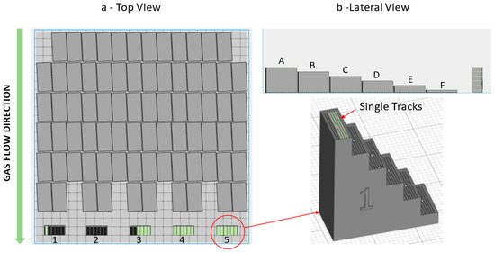 The powder bed inhomogeneities are measured and quantified in terms of the track’s stability, Melt Pool, and Porosity analysis using a “ladder” shaped specimen. We specifically evaluate the presence of porosity for its ability to change the microstructure and subsequently deteriorate the mechanical properties of the materials [51]. Each specimen is provided with six single tracks on its top surface and placed in five positions in the lower part of the building platform, as shown in Figure 1. The dimensions of the specimen and Single Tracks are reported in Figure 2.