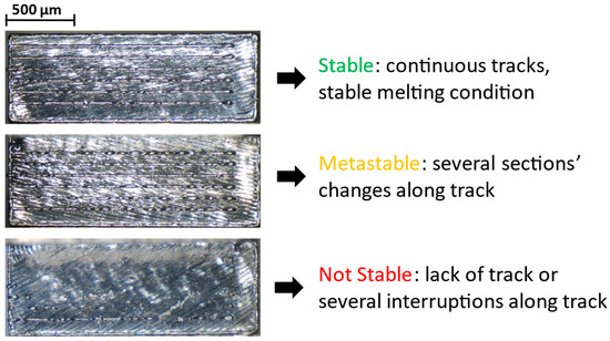 In particular, the Single Track’s stability level for each specimen is evaluated through SEM analysis of the 36 (six Single Tracks for each of the six levels) printed Single Tracks (Figure 2) with a magnification of 40× on the microscope (TESCAN MIRA 4, Tescan, Brno, Czech Republic). The algorithm and criteria adopted to evaluate the level of stability of Single Tracks is based on the calculations of the number of interruptions along the length of the track as fully described in [20].