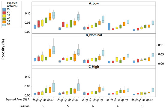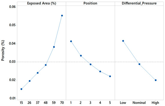 Figure 8 shows the interaction between parameters for porosity formation in the material. From Figure 8, it can be inferred that the interactions between the Exposed Area, Position, and Differential Pressure are either low or zero. No interaction is evident between the Exposed Area and Differential Pressure. In contrast, a low interaction level is registered between the Position and Exposed Area for some combinations and between the Position and Differential Pressure (i.e., Position 4 and Exposed Area of 14% and 26% and Differential Pressure Nominal and Position 4/5). This result is of utmost interest as it allows each parameter to be optimized separately without influencing the others.