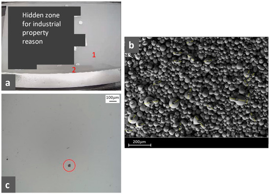 (a) Image of the building chamber during the printing process in which the presence of spatter particles above the powder bed is visible as a darker area, zone 2, with respect to the regular powder bed, zone 1; (b) SEM image of the powder found in zone 2 with many particles characterized as spatter particles for evidence of larger and/or deformed shape; (c) porosity of a zone with Lack of Fusion (LOF) defects probably due to the presence of spatter particles on the powder bed.