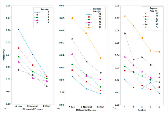 Interaction plots for porosity overview: (a) Differential pressure vs. position; (b) Differential pressure vs. exposed area; (c) Position vs. exposed area.