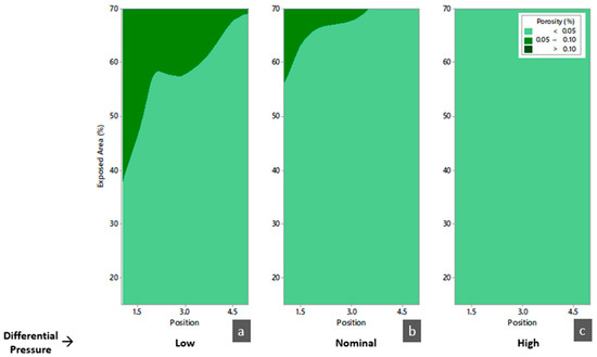 Contour plot of porosity percentage measured as function of exposed area, position and differential pressure: (a) Low level; (b) Nominal level; (c) High level.