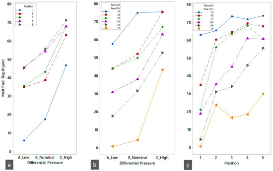 Interaction plots for melt pool depth overview. Interaction plots overview: (a) Differential pressure vs. position; (b) Differential pressure vs. exposed area; (c) Position vs. exposed area.
