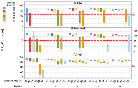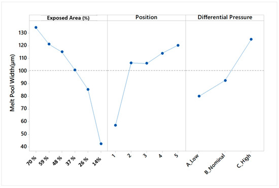 Figure 13 represents the interaction plot to identify the interactions between Exposed Area, Position, Differential Pressure and Melt Pool Width, respectively. From Figure 13, the results indicate an absent or very low level of interaction between the various parameters on the Melt Pool Width. However, further analysis was performed to verify the main effects on the Melt Pool Width in terms of the same three parameters, taking into account the considerations that were made for the porosity analysis.