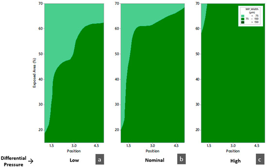 Contour plot of melt pool width as a function of exposed area, position and differential pressure: (a) Low level; (b) Nominal level; (c) High level.