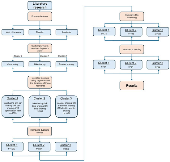 During the database searches, a range of keywords was applied to narrow and focus the results. For each modality, a primary keyword was used along with its various iterations to maximize the comprehensiveness of the search. The keywords included “carsharing”, “car sharing”, “bikesharing”, “bike-sharing”, “bike sharing”, “scooter sharing”, “e-scooter sharing”, and “electric scooter sharing”. Although the terms are conceptually similar, different authors often use varying terminology; therefore, all potential variations were incorporated to ensure the breadth and inclusivity of the search. As carsharing was the central focus of the review, particular attention was given to this area, with an emphasis on fleet optimization and related research.