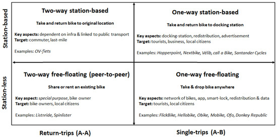 63] created a typology of bikesharing models. Regarding the details in topology and the fact that it encompasses all models currently in use, it can be said that this is the best definition, and that all future definitions should be linked to this topology—except for the term “one-way”, as it was previously stated that this terminology is not technically accurate.