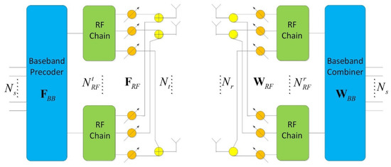 Consider the Massive MIMO analog–digital hybrid precoding system model as shown in Figure 1.