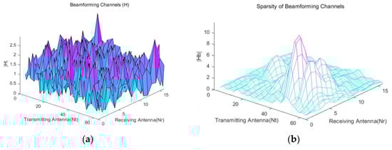 The beamspace channel matrix is a unitary equivalent representation of the antenna domain channel matrix , meaning that is the projection of onto the Fourier orthogonal basis. Due to the significant propagation loss and limited number of propagation paths in mmWave transmission, the channel exhibits a low-rank (sparse) characteristic. It is important to note that the channel itself is not sparse. The sparsity of the mmWave channel becomes evident in .