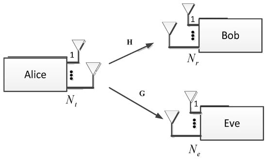 Assuming that Alice has perfect CSI for the channel matrices and . Under the assumption of a single receive antenna, the spectral efficiencies of the legitimate user’s channel and the eavesdropping channel can be expressed based on Shannon’s theorem as follows: