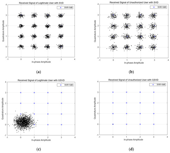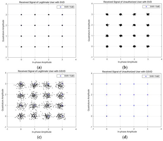 First, we compare the performance of the GSVD-based scheme and the SVD-based scheme in a fully digital system. Figure 5a,b show the constellation diagrams of the legitimate user and the eavesdropper, respectively, formed by when , where is obtained through SVD (Equation (18)). Figure 5c,d depict the constellation diagrams formed by , which is obtained through GSVD (Equation (14)). The signal modulation scheme is 16QAM. Figure 6 illustrates the scenario where .