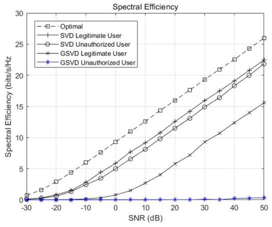 Compared to the SVD-based scheme, the GSVD-based scheme incurs a certain spectral efficiency loss. Specifically, at , the spectral efficiency loss for the legitimate user is approximately 5 bits/s/Hz, and within the SNR range of , the loss increases to about 6.5 bits/s/Hz. However, in the GSVD-based scheme, the spectral efficiency of the eavesdropper is suppressed to zero, which demonstrates the security capability of the scheme.