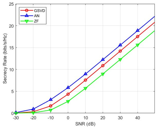 Secrecy rate comparison among GSVD-based secure beam precoding, AN, and ZF secure precoding.