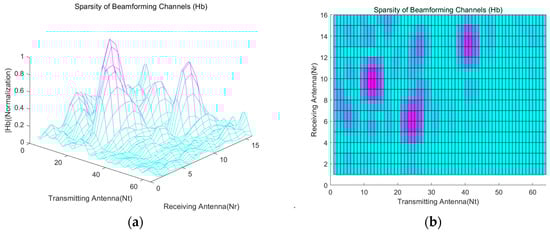 Next, the performance of the proposed algorithm in a hybrid precoding system is discussed. Figure 9 verifies the sparsity of the beamspace channel in the GSVD-Sparsity algorithm. Figure 9a shows a 3D beam pattern, while Figure 9b presents the 2D planar beam pattern. In Figure 9a, only a few prominent peaks can be observed, and in Figure 9b, the red-colored elements indicate beams with relatively high power. It is clearly shown that there are only a few strong paths, demonstrating that the sparse beamspace channel exhibits high directionality.