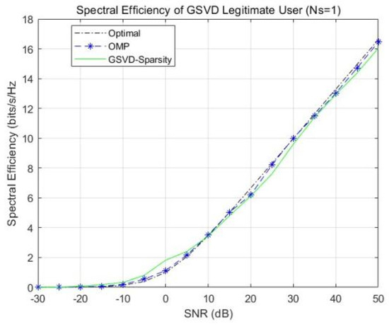 Spectral efficiency of the legitimate user when using the GSVD-Sparsity algorithm in a hybrid precoding system.