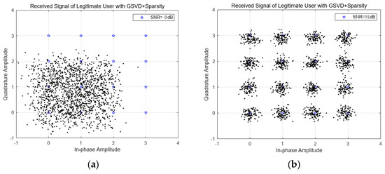The received constellation diagrams of the legitimate user employing the GSVD-Sparsity algorithm in a hybrid precoding system: (a) ; (b) .