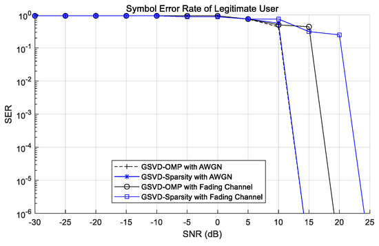 To verify the robustness of the proposed GSVD-Sparsity algorithm under different channel conditions, Figure 12 presents the symbol error rate (SER) performance under both additive white Gaussian noise (AWGN) and multipath fading channels, with 16QAM modulation employed at the legitimate user. The figure includes four curves, corresponding to GSVD-OMP with AWGN, GSVD-Sparsity with AWGN, GSVD-OMP with a fading channel, and GSVD-Sparsity with a fading channel. It can be observed that under AWGN channel conditions, the two curves on the left (i.e., GSVD-OMP and GSVD-Sparsity under AWGN) are almost overlapping, indicating that both methods achieved a similar SER performance when the channel was ideal. Under multipath fading conditions, the two curves on the right begin to diverge after 15 dB, showing that in worse channel conditions, GSVD-OMP achieved a slightly lower SER than GSVD-Sparsity. However, as the SNR increases, the SER for both methods drops rapidly to zero. Therefore, GSVD-Sparsity maintained high reliability under high SNR conditions and can be extended to various channel models.