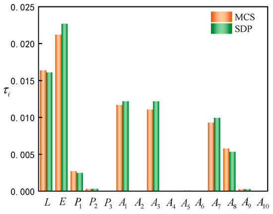 It can be seen from Table 1 and Figure 4 that the ordering of FFP-IM is as follows: . This indicates that the fuzzy variable exerts the most significant influence on the FFP for the structural system and should receive greater consideration in reliability design. Utilizing the MCS method, we compute the conditional failure probability based on a robust sample size of , and samples are used for the mathematical expectation. For this example, the LSF is non-monotonic, and optimization algorithms are needed to calculate the NPR index, so the sequential quadratic optimization approach is used in this paper. As illustrated in Figure 4, the SDP method attains a level of accuracy comparable to that of the MCS method; yet, it achieves this with a substantially lower computational burden. Specifically, the MCS method necessitates a cumulative sample count of 4 × 108, whereas the SDP method accomplishes the task with merely 1500 samples.