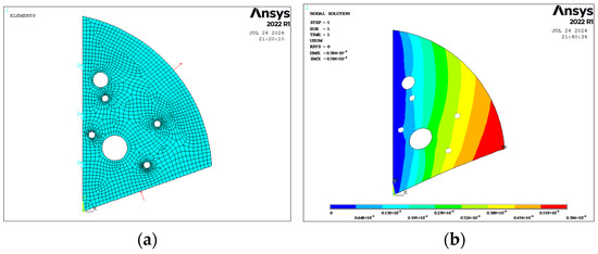 FEA of the stiffener rib. (a) Mesh grids and loads and constraints. (b) Deformation maps.