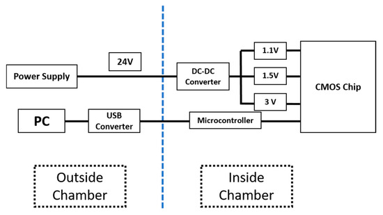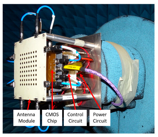 Figure 5 presents the schematic circuit of the beamformer and power control. The CMOS Beamformer is controlled by a microcontroller STM32f072 from the company STMicroelectronics NV (Geneva, Switzerland), which is behind the Beamformer, as shown in Figure 2. To communicate with the control board from outside the anechoic chamber to the inside, a USB to RS232 converter from the company Waveshare Electronics (Shenzhen, China) is used to send the SPI commands from a computer to the beamformer. The commercial beamformer is provided by Chengdu Xphased Technology Co., Ltd. (Chengdu, China). The Beamformer TRHJ-4011-F has eight channels with 6-bit control in both amplitude and phase, as shown in Figure 1. The step of amplitude is 0.5 dB and 5.625° in the phase. Since the current consumption of the beamformer is high, it cannot be directly powered from outside of the chamber, as the inductance of the cables creates stability problems with the beamformer. This voltage regulator from the company ASHATHA Shenzhen, China) guarantees a stable current distribution to the beamformer IC as it protects the beamformer from any transitory induced by the long connecting power cables. The blue dashed line in Figure 5 separate the transmitting part of the control signal outside of the chamber and the receiving part of the control signal inside.