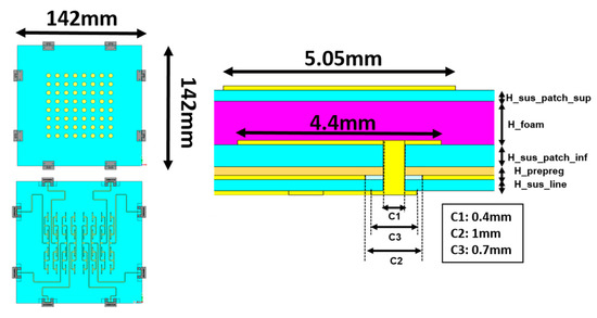 The proposed antenna is an 8 by 8 subarray of double-stacked patch radiating elements working from 17.7 GHz to 20.2 GHz. The reason for using this structure is to increase the bandwidth of the antenna by stacking patches. Figure 3 presents the 8 × 8 simulation model and the stack up of the structure. The passive antenna is simulated by the commercial software CST Studio Suite 2024; the following figure presents the stack-up of the multilayer antenna and the simulation model of the passive 8 × 8 antenna with all the components, including the commercial connector Southwest End Launch (Tempe, AZ, USA). All substrates used in the design of the antenna are from the company from the company Rogers Corporation (Chandler, AZ, USA).The substrates are Rogers RO4350B, with a dissipation factor tan δ of 0.0037 @10 GHz and a relative permittivity of 3.48. The 1 to 8 power divider is formed on a substrate whose thickness is 0.254 mm thick at the bottom, and metallic vias connect the feed network to the lower patch, as shown in Figure 3. The substrate on which the lower patch is printed is 0.504 mm thick. In order to prevent misalignment errors, this structure is adhered to using a 0.101 mm thin prepreg Rogers 2929, whose relative permittivity is 2.94 and dissipation factor tan δ is 0.003 @10 GHz. The element spacing is 0.6 λ0 at the center frequency (18.95 GHz). The size of the top patch is 5.05 mm in diameter and the bottom patch is 4.4 mm in diameter. The feed network and the upper parasitic patch have been printed at the bottom layer of the substrate Rogers RO4350B, and a foam of 1 mm of height with a permittivity of 1.07 is slipped in between layers to control the separation between active and parasitic patches.