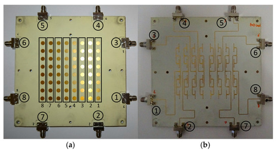 Figure 4 shows the prototype of the array; the front of the antenna is shown in Figure 4a, while Figure 4b illustrates the reverse side of the antenna. As can be seen on the rear side of the antenna, the feed lines from the edge to the antennas are optimized in order to avoid phase difference between the different columns of the antenna subarray. As shown in Figure 4 The connector model used is the Southwest End Launch model (Tempe, AZ, USA). As the connectors are considerably large with respect to the antenna patches, the size of the ground plane has been increased to ensure that the connectors do not influence the radiation pattern of the array. The increased simulation model of passive antenna size is 142 mm × 142 mm, as shown in Figure 3. The columns have been enumerated as illustrated in Figure 4.