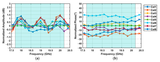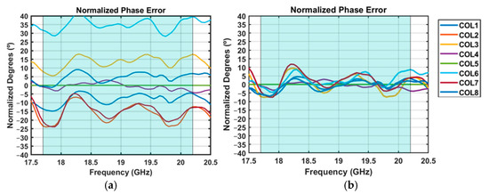 The obtained initial phase stage result is shown in Figure 10a. Again, the phase unbalance is normalized to column 5, and it can be observed that the unbalanced phase differs from the passive antenna, indicating that the beamformer and the cables also introduce additional phase errors. In order for the columns to exist in the same phase state, the center frequency 18.95 GHz is used as the calibration frequency. By varying the states of the beamformer phase shifters, the S21 phase states depicted in Figure 10b can be obtained. It can be seen that the phase error has been significantly reduced; while it cannot be zero, the phase error is smaller than the phase step of the beamformer.