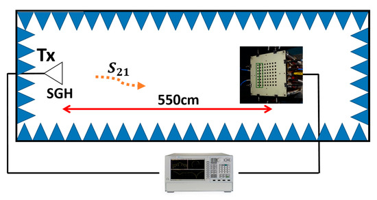 The REV technique can retrieve each element individual excitation by sweeping that element phase shifter. Since the programmed phase shift for a given amplitude measurement is known a priori, through the mathematical procedure describe in [18] the initial element excitation is calculated [18,23]. The proposed phased calibration need 2 × N measurements. The measured set up is shown in Figure 8: a standard gain horn antenna (SGH) is used as a probe in the far-field conditions (550 cm) to obtain the S21 parameter for each of the columns, deactivating the rest of the columns using the beamformer control. During the calibration process, the temperature of the facility is controlled (22 °C) and there is no temperature dependence for the calibration. In the proposed method, the phase is considered to be a calibration variable, so that the amplitude variation, when changing phase state (PM-AM performance), is not affected in the calibration process, thereby reducing the number of calibration measurements and iterations.