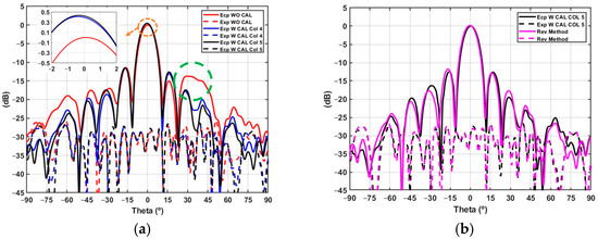 The calibration frequency and the selected reference column are arbitrary; any frequency and any column can be selected as reference, as we can see in Figure 11a. The comparison of the horizontal cut of the phased array radiation pattern at the center frequency of 18.95 GHz with and without calibration is shown in Figure 11a for two different reference columns. As can be observed, the radiation pattern without any calibration stage shows a diffraction lobe in the green circle, which causes a loss in the maximum directivity of the array. By selecting an arbitrary column for calibration, Figure 11a presents two calibrations that use different columns as references. A 0.5 dB improvement in the maximum value of the radiation pattern can be observed, with increased power in the main lobe and an improvement in the secondary lobes (including the diffraction lobe present in Figure 11a, with deeper nulls in both cases). Figure 11b presents the comparison of the radiation pattern using the phase calibration and REV method. The obtained results are similar, and the improvement using the REV method is insignificant, with respect to the phase calibration method proposed.