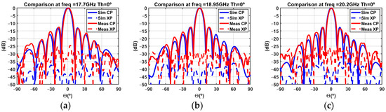 (a) Comparison of radiation patterns at frequency = 17.7 GHz. (b) Comparison of radiation patterns at frequency = 18.95 GHz. (c) Comparison of radiation patterns at frequency = 20.2 GHz.