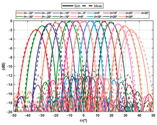 Once the calibration has been demonstrated to work for broadside in the entire working band, progressive phase shifting is applied to steer the beam from −35 degrees to 35 degrees for the phased array. Since the discrete phase step of the beamformer is 5.625 degrees, there are certain states in which the closest phase state (previous or subsequent) should be selected. Figure 14 presents the comparison of radiation patterns of the antenna at the center frequency (18.95 GHz). As Figure 12 and Figure 13 show, the behavior of the phased array at the lower and upper frequencies is very similar.