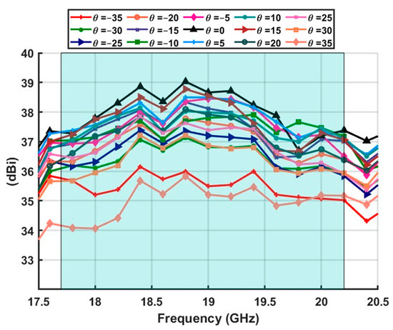 Finally, the realized active phased array antenna gain is measured by comparing with a calibrated standard gain horn antenna (SGH). Figure 15 shows the measured realized gain for all the beam steering directions; the highest gain of the phased array occurs in the broadside direction. The further you move away from the perpendicular axis of the array, the more the gain decreases. As can be seen in Figure 15, in the worst-case gain loss is 4 dB. The measured realized gain includes the losses of the cables, the additional lines that move the connectors away from the columns and the losses of the connectors.