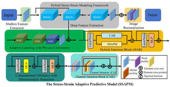 The Stress–Strain Adaptive Predictive Model (SSAPM). This model integrates multi-scale feature extraction, hybrid stress–strain modeling, and adaptive learning mechanisms to enhance stress–strain predictions. The framework consists of shallow and deep feature extraction modules, hybrid attention blocks (HAB), computationally efficient dimensionality reduction techniques, and a physics-consistent learning paradigm. Key components include the Channel Attention Block (CAB), Layer Normalization (LayerNorm), and Multi-Layer Perceptron (MLP), enabling the SSAPM to balance data-driven learning with fundamental physical constraints. The integration of physics-informed and machine learning techniques ensures accurate, scalable, and interpretable predictions in structural mechanics applications.