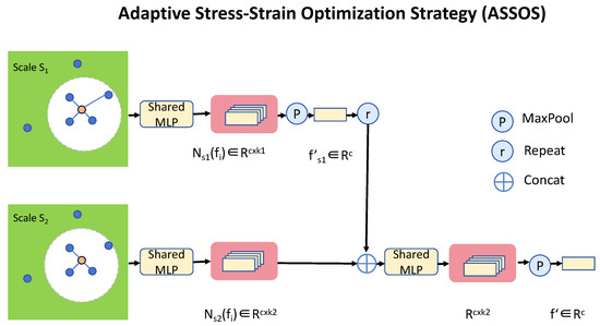 The Adaptive Stress–Strain Optimization Strategy (ASSOS) architecture integrates multi-scale coupling with shared MLP layers for feature extraction across scales and . Key operations include MaxPooling (P), repetition (R), and concatenation (⊕), enabling efficient stress–strain representation and fusion. ASSOS leverages shared representations to balance computational efficiency with accurate modeling of heterogeneous material behaviors.
