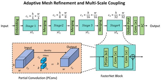 Adaptive Mesh Refinement and Multi-Scale Coupling in ASSOS. This framework integrates adaptive mesh refinement (AMR) and multi-scale coupling to optimize computational efficiency while maintaining high accuracy in stress–strain predictions. The hierarchical structure consists of multiple stages, where spatial resolutions are progressively refined through embedding, merging, and global pooling operations. The bottom-left inset illustrates Partial Convolution (PConv), which selectively applies convolutional filters to extract relevant features while maintaining computational efficiency. The FasterNet block (bottom-right inset) employs PConv and pointwise convolutions to enhance information propagation across scales. This integration ensures that high-gradient regions, such as crack tips and inclusions, receive enhanced resolution, while low-gradient areas retain coarse discretization. The model also incorporates a two-way micro-macro coupling mechanism, facilitating accurate homogenization of material behavior across scales, making it suitable for complex material simulations and fracture mechanics analysis.